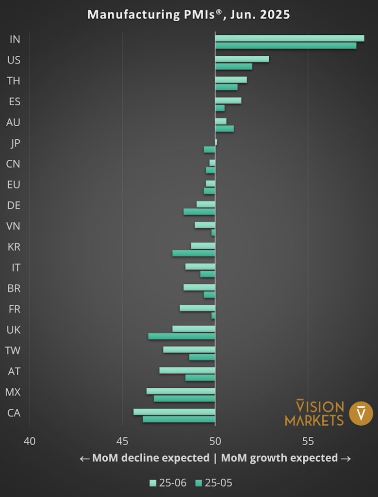 The global manufacturing sector displayed varied trends in June. The US showed strong recovery with a Manufacturing-PMI of 52.9, driven by new orders and domestic demand. The Eurozone continued to contract at 47.5, with easing inflationary pressures. Germany reached a 34-month